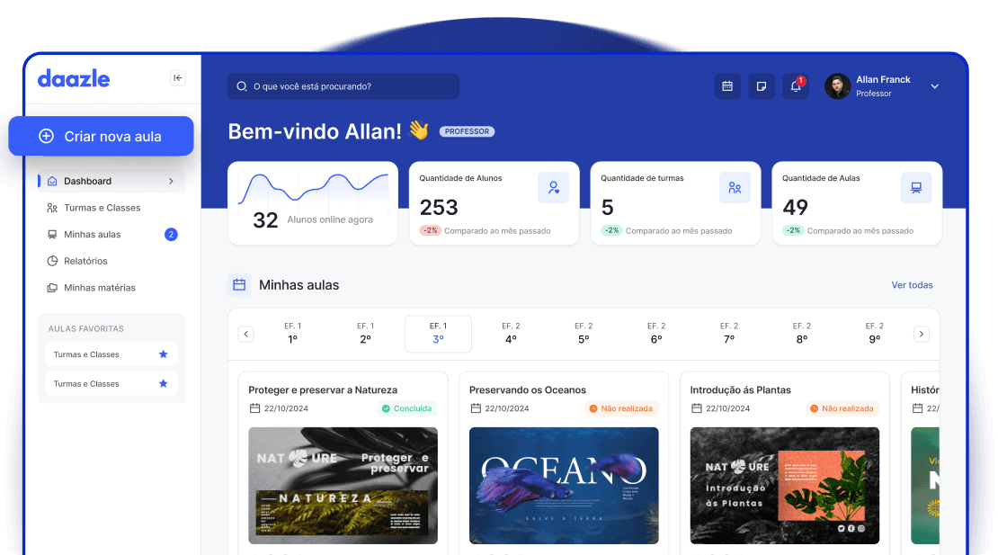 A Daazle é uma plataforma educacional com inteligência artificial que transforma aulas que já existem (PowerPoint ou slides) em aulas interativas, alinhadas ao currículo, com coleta de dados em tempo real.